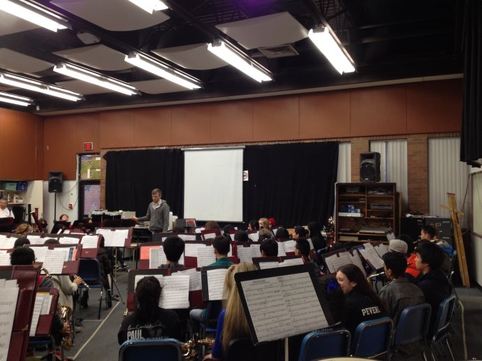 因为参观时间是上午九十点钟,人常 说,“一日之计在于晨”,在加拿大的高中生们的早晨却相对更放松,从埃尔金公园中学的走廊经过时,一个班的学生正在上吉他演奏课,还有俩学生坐在走廊的长 椅上切磋演奏技巧;餐厅摆放着一长溜乒乓球台,不少学生聚在一起打球;室内羽毛球场地人声鼎沸热火朝天。校长Bruce Filsinger先生带我们经过学校剧场时,有一位优雅的女教师正在给十多个学生上戏剧表演课。看到有访客来,这位老师特意走过来打招呼,并解释说,这个班目前看起来比较小,是因为部分学生到中国交流演出去了,还没有回来。在塞米亚摩中学看到的也是类似景象。校长Bea Hadikin女士自豪地说,该校的管弦乐队是北美最好。那天乐队练习的曲目刚好是动画片《狮子王》中的插曲Can you feel the love tonight? 悠扬的旋律不由得引人驻足。指挥、演奏者、听众都忘情地沉醉其中。那一刻我在怀疑,我是在一所中学还是音乐会现场?在室内篮球场,正在举办一场校际之间的友谊赛,篮球场门口的橱窗展示着该校球队历年获得的各种比赛荣誉。从队员,拉拉队,到组织者,都是学生自愿者,入口处还有学生的义卖活动,为球队募捐。