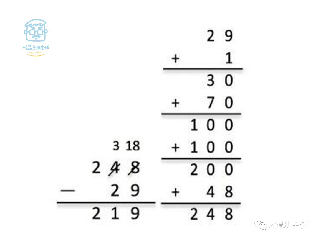 上图中,左边使用的是传统公式减法,而右图则是“发现式数学法”,提倡使用创新型思维解决数学题,聪明的家长读者,应该一眼就看出区别了吧……