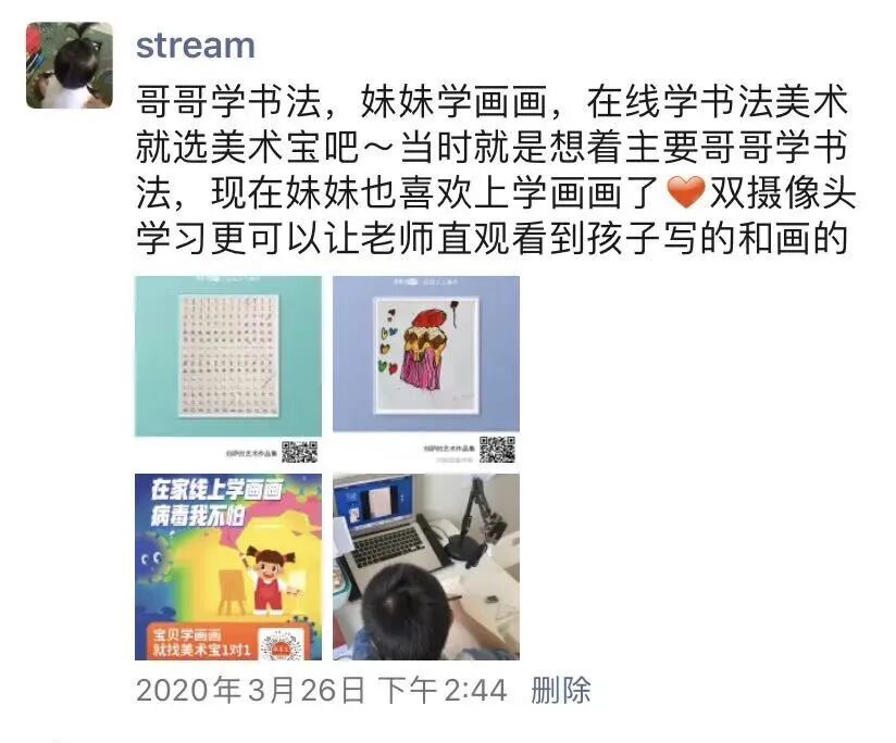 所以对于已经在海外的家庭,美术宝会免费给大家邮寄摄像头和支架,方便海外孩子进行学习。对于从小生长在海外的孩子来说,和国内的老师学习,不仅仅可以学习书法或绘画,同时还可以通过和老师对话,来提高母语水平,这可是一箭双雕呀!