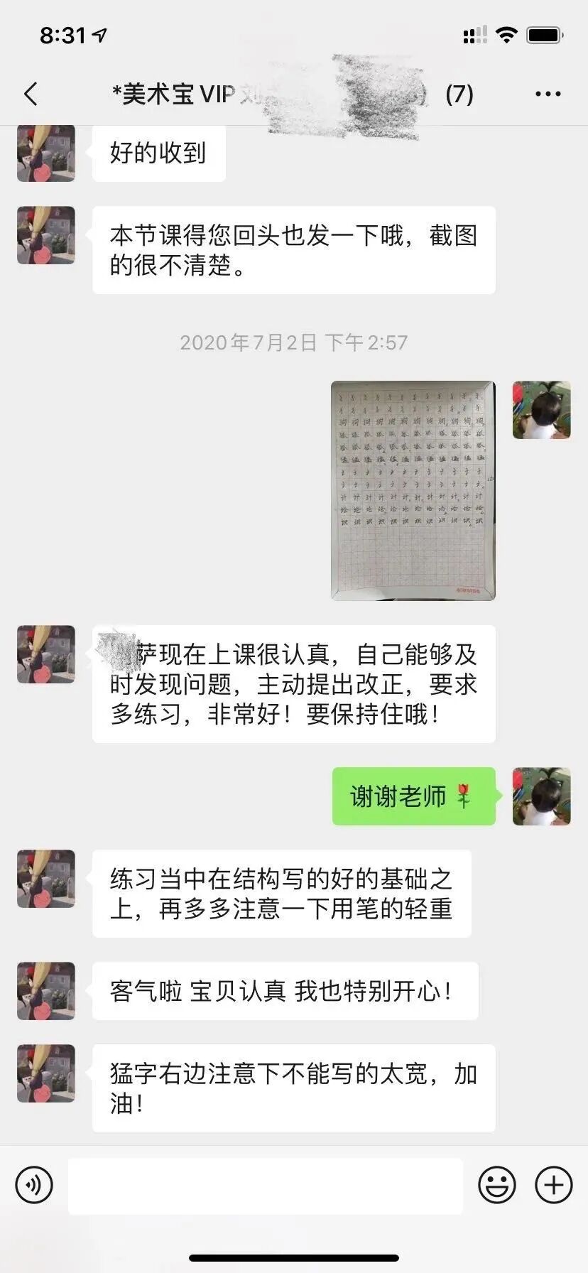双摄像头也发挥了大作用,老师和孩子可以相互看清笔画。老师也非常负责任,孩子写的有问题时都会及时纠正,而不是大大咧咧的就放过去了,当然了,每一个写的比较好的字也会让孩子自己标注出来,自己可以对比看看为什么这几个是好,那几个要差一些。最后老师会布置作业,课下自己练习,拍照片发到群里,老师会点评和指导。