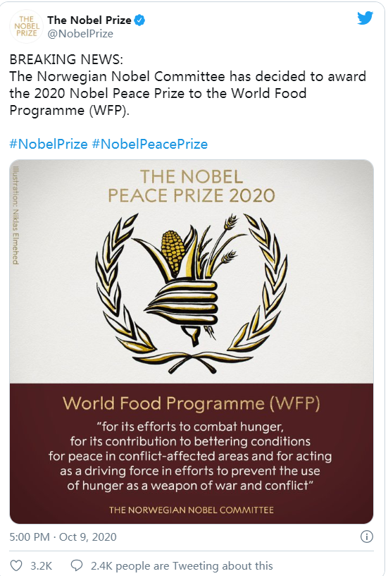 2020年诺贝尔和平奖尘埃落定,世界粮食计划署爆冷获奖。