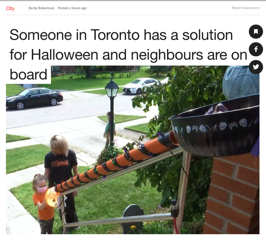 索要糖果,是每年孩子万圣节的必须项目。今年现实条件或许不允许,但居民们发明的这种方式:由于它是非直接接触的,并增加了新的乐趣,因此在网上获得了很大的关注,并且,这个想法已经在至少一个多伦多地区流行。