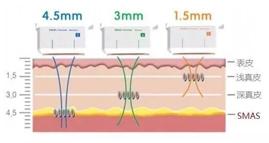 超声刀分三的不同深度探头,分别是1.5,3.0,4.5,各种不同深度的探头作用于不同层面的紧致,这也是超声刀与其他技术不同处。
