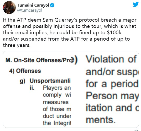 并且表示,根据巡回演出制定的Covid-19协议,如果奎里的行为被视为“公然”或“重复”违反了所要遵守的规定,则可能面临高达100,000美元的罚款,甚至可能被停赛三年。