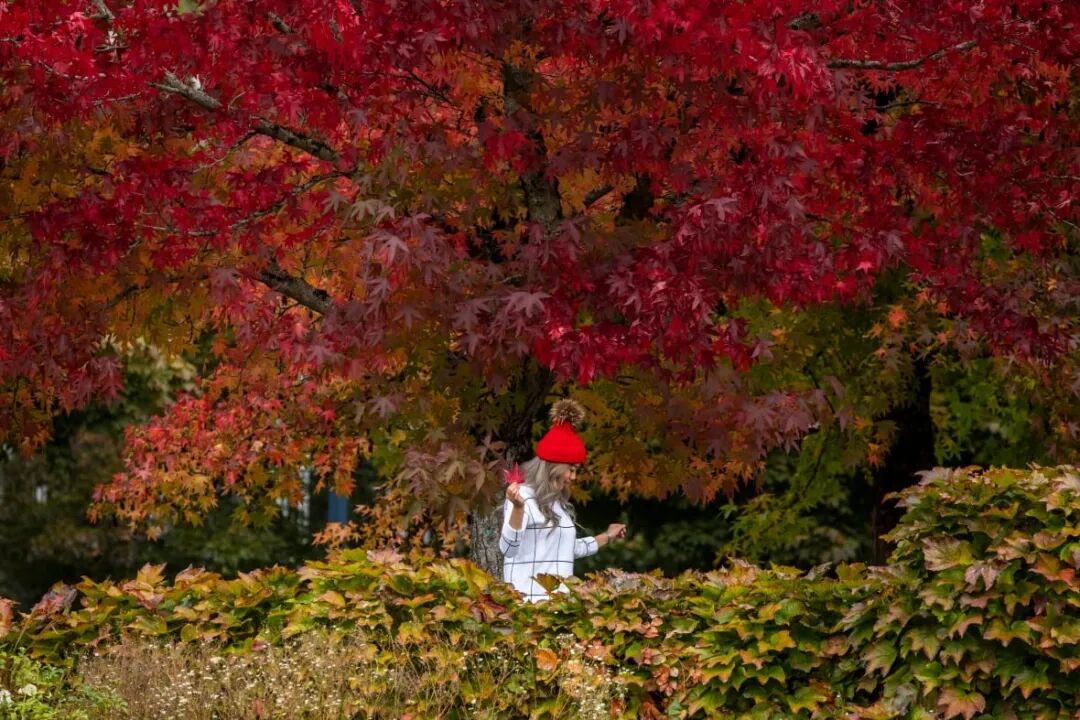 在温哥华George Wainborn公园附近,一个女生和她的朋友在一片枫树前摆拍,摄于本周五。(图源:CBC)