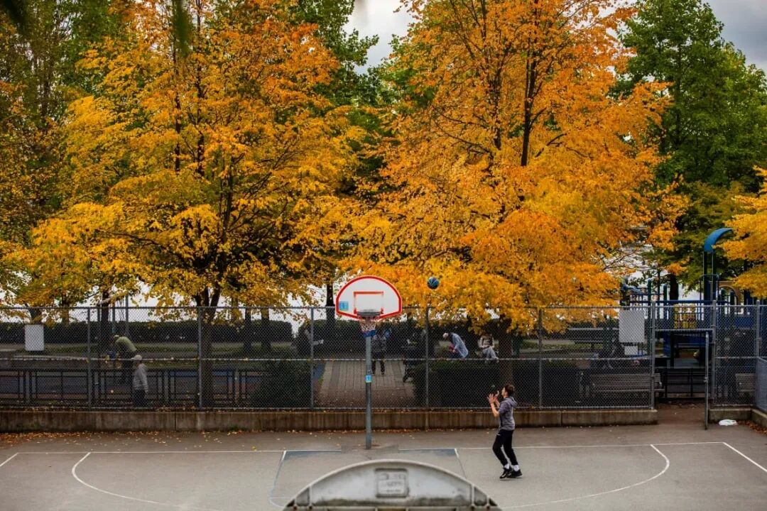 温哥华David Lam Park内,去赏枫还可以打打篮球,摄于本周五。(图源:CBC)