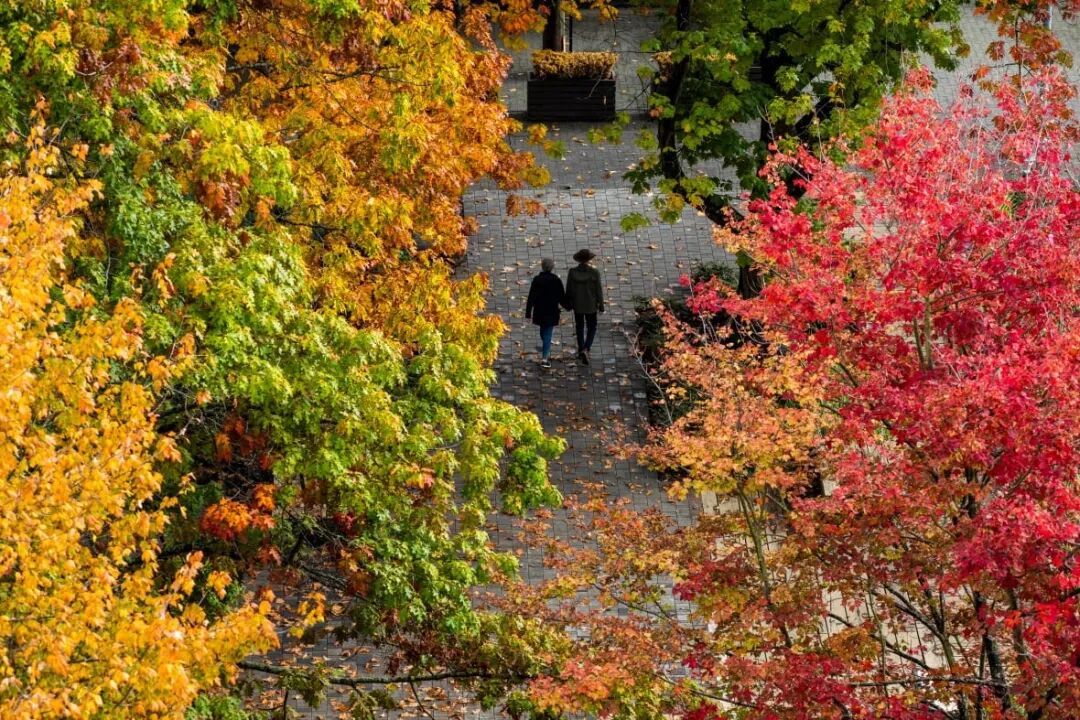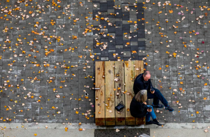 温哥华最文艺的社区之一Granville Island,被枫叶装点得小唯美,两人在喝咖啡。摄于本周五。(图源:CBC)