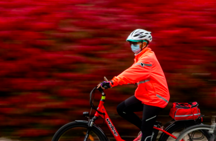 False Creek 海堤步道上枫树茂盛,一个女生在骑自行车。摄于本周五。(图源:CBC)