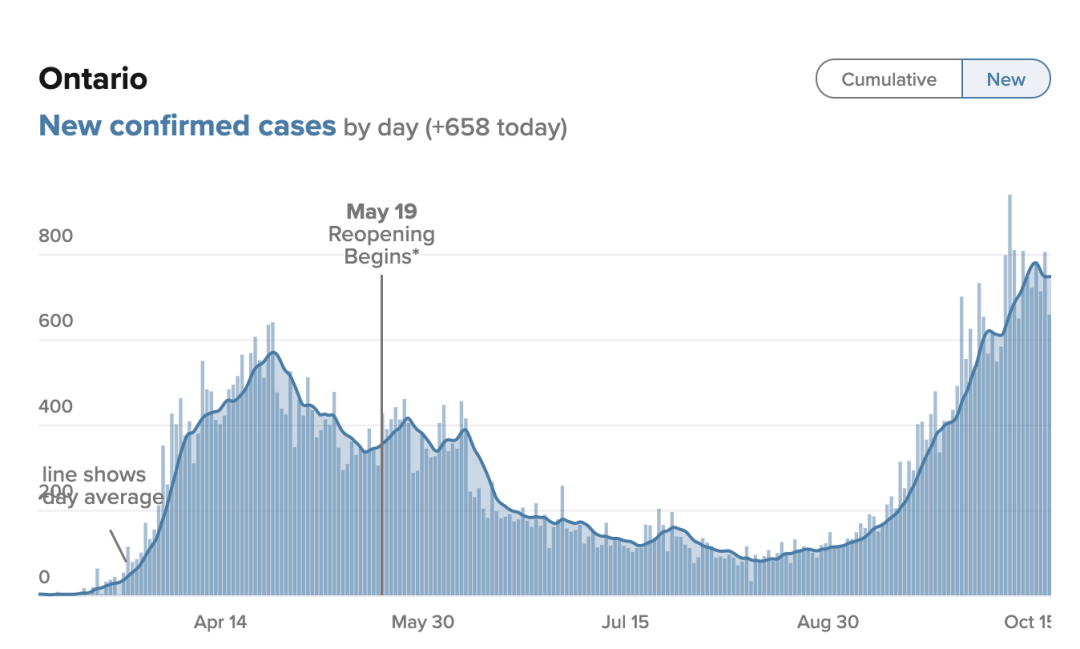 周日10月18日,安省最新数据显示,今日确诊新增658例,近几天里录得最低数量的一天。