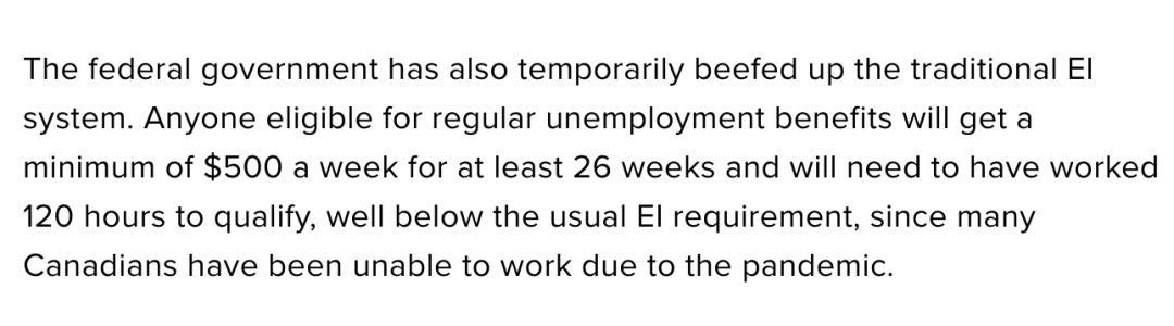 此外,政府还临时降低了传统EI的门槛,只要失业前工作满120个小时,也可以申请EI,每周领取$500,一共可以领取26周。