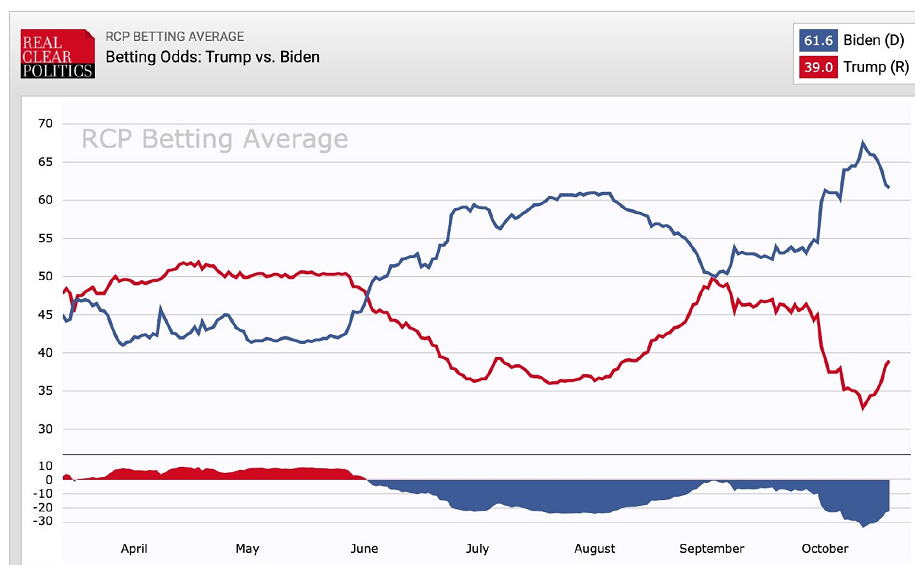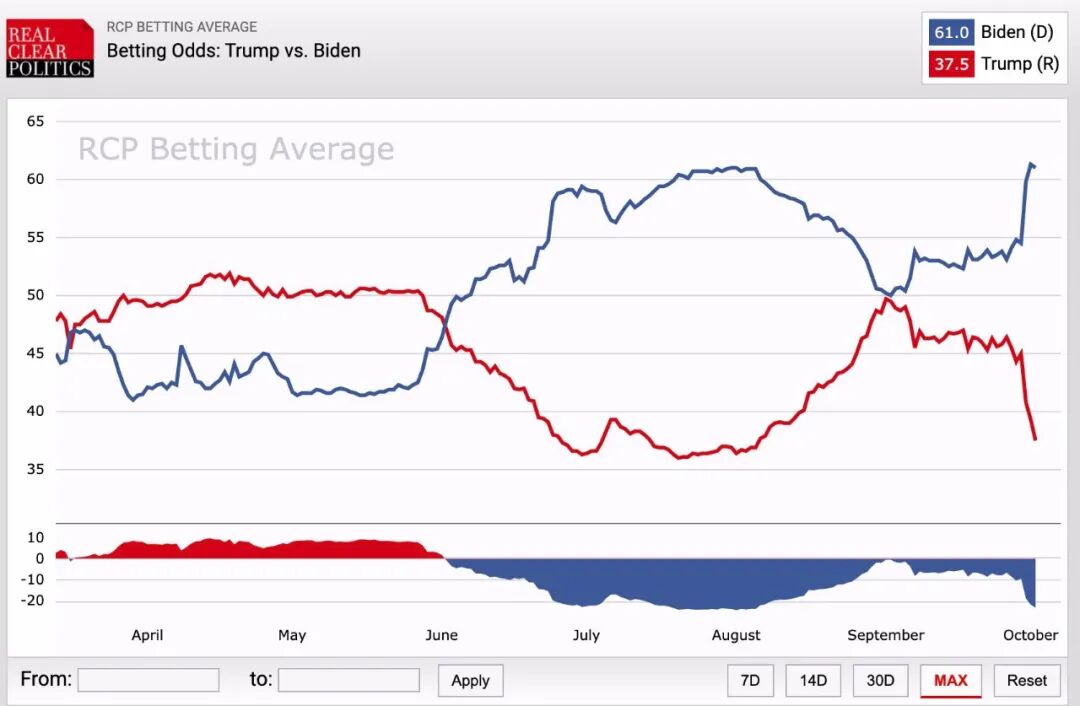 这是10月2日的赌盘数据,根据真实清晰政治(RealClearPolitics)统计的平均数据,拜登的赌盘胜率飙升至61%,而特朗普则跌至37.5%。