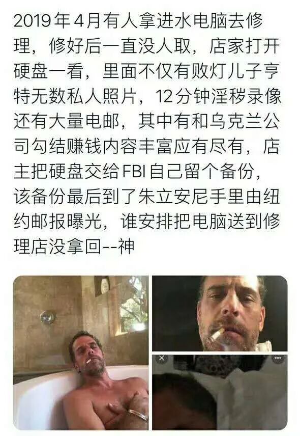 因为里面的资料过于劲爆,2019年12月,店主把这部电脑交给了FBI,不知掉为什么,这些资料居然到了特朗普律师手里,并在选举前最后一刻,被故意放出。