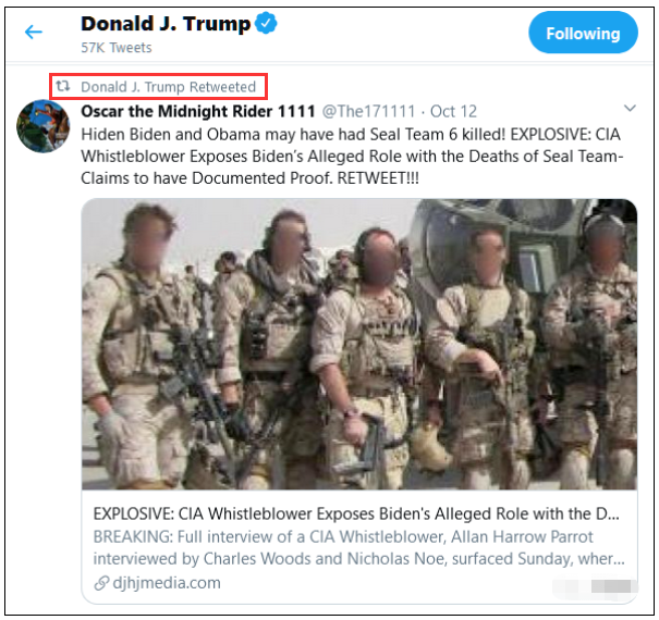 这条推文,大致意思是:本·拉登还活着,当年被击毙的,只是他其中一个替身,当时美国总统奥巴马和副总统拜登都牵涉其中,为防真相败露,他们还杀害了第六海豹突击队员灭口。