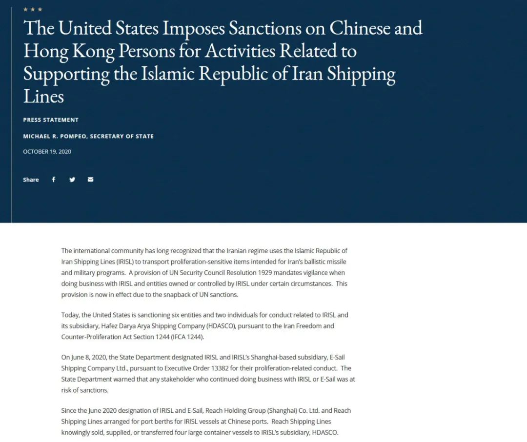 美国国务院表示,美国根据《伊朗自由和反扩散法》第1244条(IFCA 1244),决定制裁与IRISL及其子公司伊朗哈菲兹船务有限公司( HAFEZ DARYA ARYA SHIPPING Co.)有关的六家实体和2名个人。2020年6月8日,根据第13382号行政命令,美国国务院宣布IRISL和IRISL在上海的子公司E-Sail航运有限公司从事与核扩散有关的行为。美国国务院当时警告称,任何继续与IRISL或E-Sail做生意的利益相关者都有受到制裁的风险。