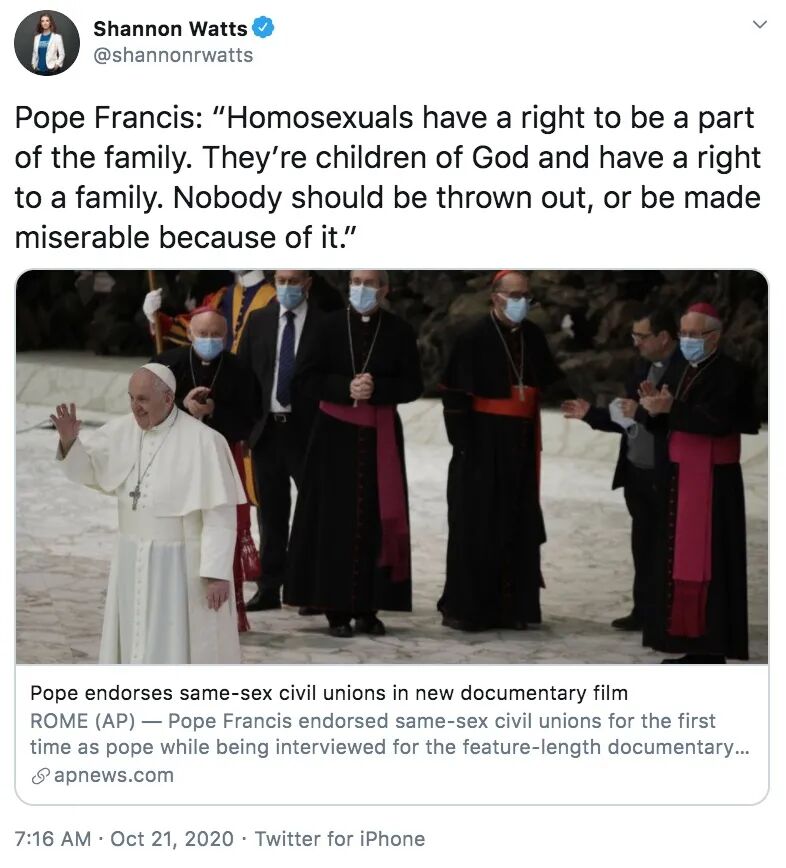 此言论一出震惊世界。迅速冲上各大媒体报刊的头版头条,也稳稳占据推特热搜,因为梵蒂冈教皇所说的话,引发了整个天主教世界的价值观地震。