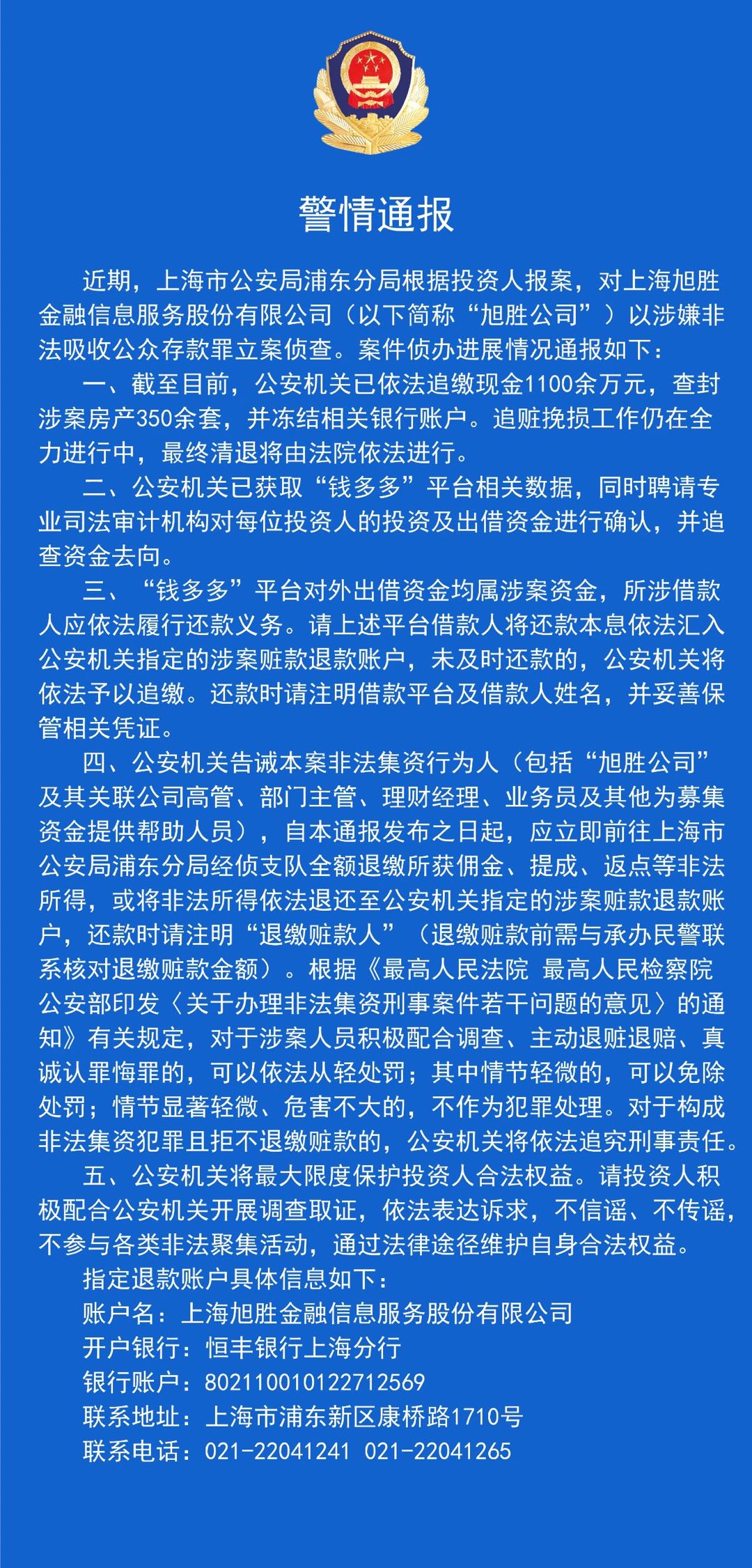 10月21日,据上海市公安局浦东分局官方微信公众号“警民直通车浦东”发布,近期上海市公安局浦东分局根据投资人报案,对上海旭胜金融信息服务股份有限公司(以下简称“旭胜公司”)以涉嫌非法吸收公众存款罪立案侦查。而旭胜公司运营的网贷平台名为“钱多多”。