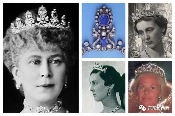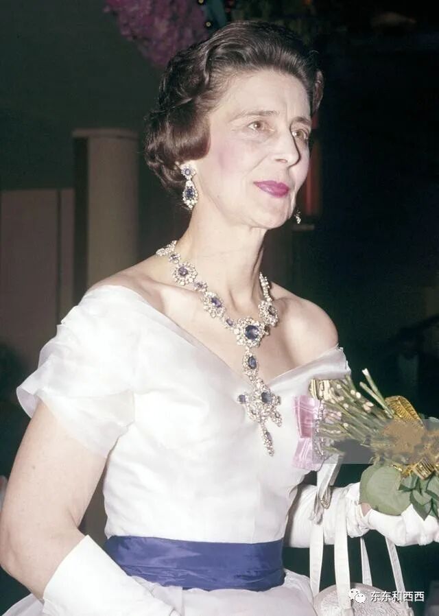婆婆玛丽王太后待她不薄,传给她全套蓝宝石镶钻首饰。这顶剑桥蓝宝石王冠,和配套项链、耳环、胸针,玛丽娜一直戴到晚年,又传给了大儿媳↓↓
