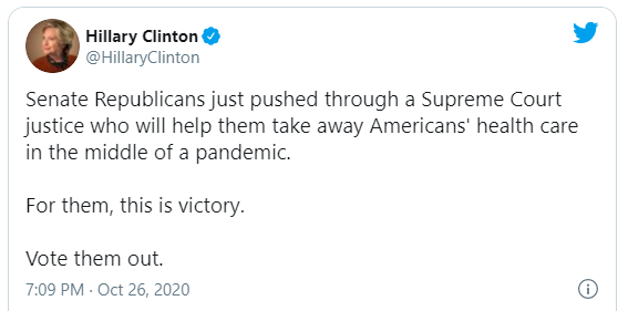 “刚刚参议院共和党人赢得了美国最高院的大法官,这将帮助他们在疫情中夺走美国人的医疗保障。