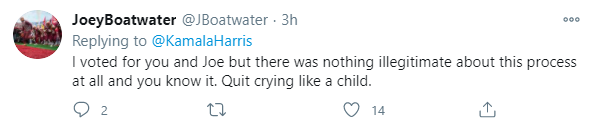 “我的选票投给了你(Kamala民主党副总统候选人),但是提名大法官这事儿并没有程序不正当,相信你也知道这一点,不要像个小孩子一样哭闹了。”