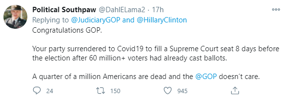 “恭喜共和党,在大选前8天6000万人已经投票的这个节骨眼任命大法官而不是控制新冠疫情,几十万人死于疫情,共和党根本不关心”