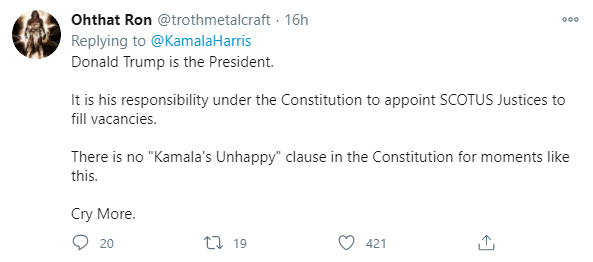 “川普是美国总统,宪法赋予了他提名大法官填补空缺的责任和权利,宪法里没有一条叫做Kamala(民主党副总统候选人)不高兴的条文。”