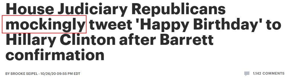 于是,共和党众议院司法委员会的官方Twitter就发了这么一条状态:“Barrett确认当选大法官,希拉里生日快乐@希拉里。”