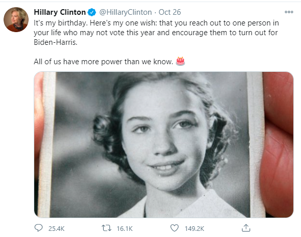 而在几个小时之前,希拉里刚刚许过生日愿望:号召大家给拜登投票。