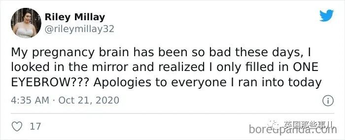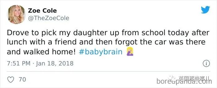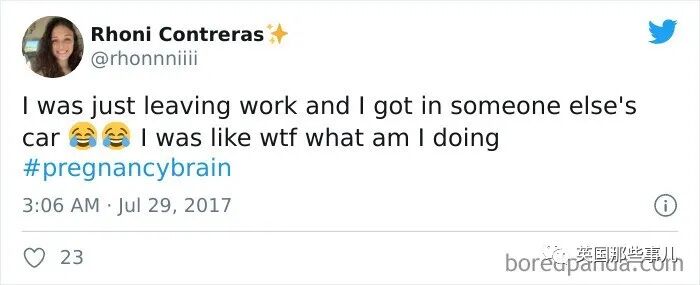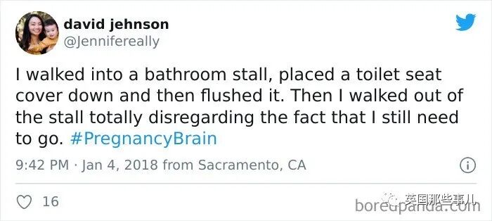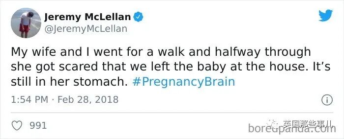 一孕傻三年的经历,看着让人好笑又心疼哇~2020-10-28 |作者: | 来源:英国那些事儿人物国际生活Loading...分享: 不知道大伙听没听说过“一孕傻三年”这个说法? 其实在国外也有类似的说法,叫做pregnancy brain(妊娠脑), 指的是女性在怀孕期间,会出现记忆力下降,注意力不集中等现象,很容易就闹出一些可爱的小笑话。 最近,就有人总结了一波,国外网友分享对于妊娠脑的吐槽…… 我跟我老婆出门散了个步,走着走着,她突然惊惶地抓住了我: “老公!我们把宝宝落家里了!!!” “亲爱的,它还在你肚子里呢……” 跟客户谈生意的时候忘了自己公司叫啥了…… 有一次我走进卫生间,放下马桶盖,冲了一下水……然后带着强烈的便意推门就走…… 我最严重的那次是, 我叠了几条毛巾,然后把它们放到了冰箱里。对,冰箱里。 然后我开着冰箱门,站在那里哭笑不得…… 下班之后,淡定地往别人车里一坐…… 我都蒙了,我到底是咋想的?? 为了定闹钟,我打开了计算器…… 我给孩子盛装打扮,去学校参加万圣节派对去了。 但事实上今天根本不是星期五,啊,这周甚至都不是万圣节那周…… 最近这几天,我的妊娠脑问题特别严重。 比如刚才我照了照镜子才发现,我今天就画了一边的眉毛? 如果今天我吓到谁了,我跟你们道歉…… 洗完澡后,忘了洗掉护发素…… 今天中午跟一个朋友吃完午饭后,我开车去接我女儿放学, 接到之后我把车忘了,跟女儿一起走回家了…… 家里到处都找不到钥匙,同时我发现自己已经迟到了,真的是又急又气…… 最后你猜我在哪找到的…… 刚磨好的咖啡豆,又让我放回咖啡机里了…… 行吧,再磨一次…… 我曾经以为妊娠脑是编的,直到我老婆: “亲爱的~我把你的晚饭放微波炉里了~” 我一看…… 我一直不信妊娠脑这回事, 直到我今天早上做炒鸡蛋的时候,我在碗里打了一个鸡蛋,然后在盘子里……又打了一个…… 不喝水,喝婴儿油 就今天早上,上班时候发现的 怀孕之后我的脑子一团浆糊,做华夫饼的时候都能忘了放鸡蛋…… 把洗衣液放冰箱里 今天早上我开门的时候,发现了这个…… 开车抵达终点,低头一看,嘿,穿的是家里的拖鞋! 裤子穿反了…… 把鸡汤倒进奶昔搅拌机,这味道…… 我的妊娠脑早晚得要了我的命…… 我想做玉米煎饼,但忘了放进微波炉了,所以我加热了两分钟空气…… 现在,微波炉坏了 我表姐的妊娠脑 苹果肉桂蛋糕制作失败, 因为我放了12倍的发酵粉和小苏打…… 实话实说,味道其实还行…… 拿着香蕉皮,把香蕉扔了 购物单里我自己写的这个“苹果奶酪”是啥意思?谁能帮我猜一猜?? 嗯,妊娠脑是真的…… 当我终于回过神的时候,我隐约想起,我正在跟我两岁大的宝宝玩捉迷藏,他已经藏了20分钟了…… 我女儿的保姆发给我的照片……尴尬…… 我老婆说要去“买晚饭”,嗯,这就是……晚饭…… 我想给我未出生的女儿织一条鱼……我的妊娠脑告诉我织得不错…… 好吧,这些准妈妈犯的错误还都挺可爱的…… 但从另一方面来看,孕育一个生命,真的是太辛苦的一件事了……真的要让她们好好休息哇~~ 声明:转载此文是出于传递更多信息之目的。若有来源标注错误或侵犯了您的合法权益,请作者持权属证明与本网联系,我们将及时更正、删除,谢谢。 阅读 未经允许不得转载:加拿大乐活网 »一孕傻三年的经历,看着让人好笑又心疼哇~分享: