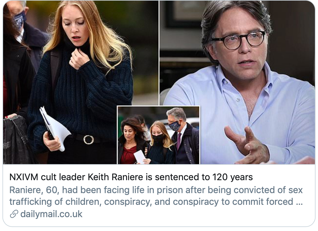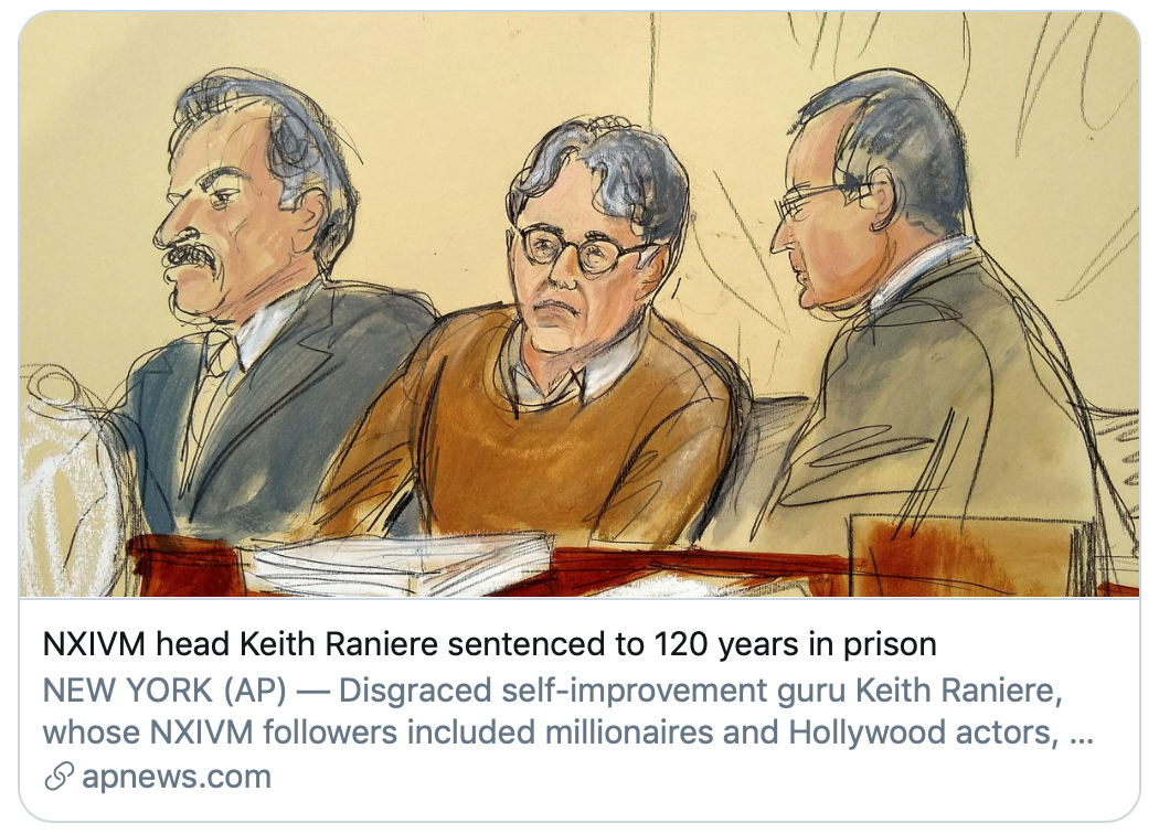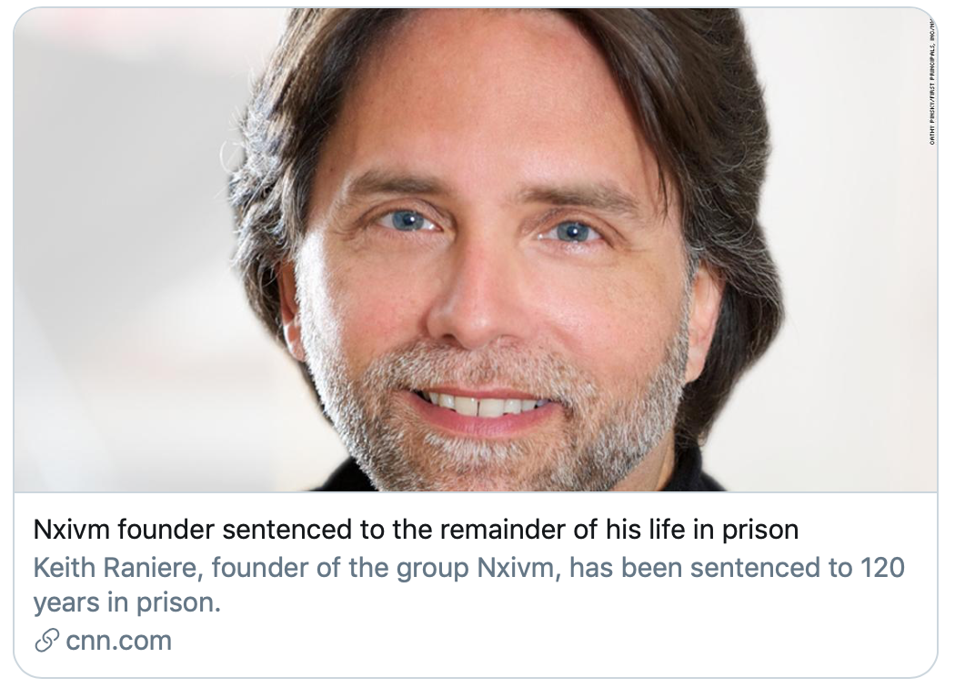 当地时间10月27日,现年60岁的美国邪教组织NXIVM头目基思·拉尼埃(Keith Raniere)被判120年监禁,这基本上意味着他有生之年都没有出狱的可能。