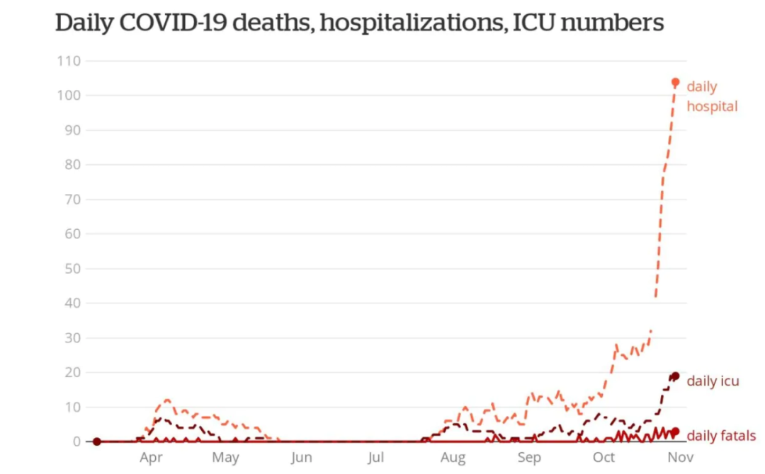 (曼尼托巴省新冠每日死亡、住院、抢救病例曲线 图自CBC)