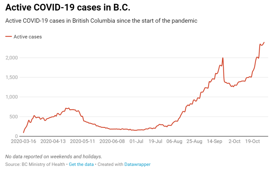 即便加拿大部分地区收紧了限制措施,但第二波受感染的人数仍已以于第一波的速度增加着。