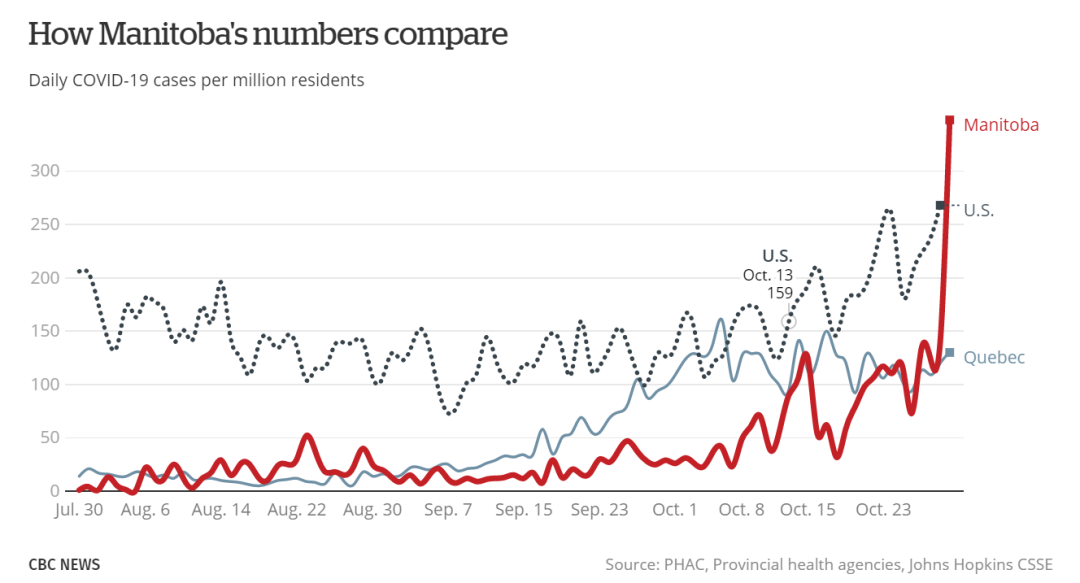 截至本周五,曼尼托巴省现在的人均新冠新增病例数是加拿大增长最快的,已经超过了魁北克、安大略等“老牌疫情大省”。