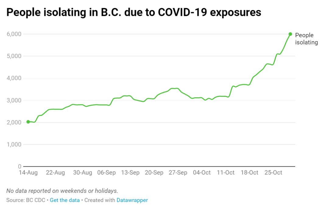 在过去24小时,BC省新增新冠感染病例272例、死亡1例,活跃病例达2390人。因接触过感染者而导致隔离的人数首次超过6000人。