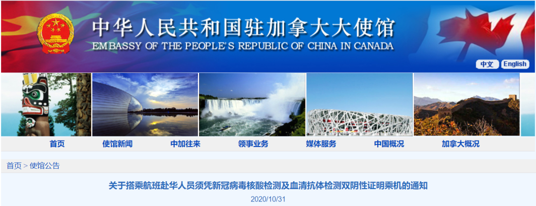 为减少疫情跨境传播,自2020年11月7日起,自加拿大搭乘航班赴华的中、外籍乘客,须凭登机前2天内在加拿大采样的新冠病毒核酸检测阴性证明和血清特异性IgM抗体(简称“血清抗体”)检测阴性证明登机,两者缺一不可。