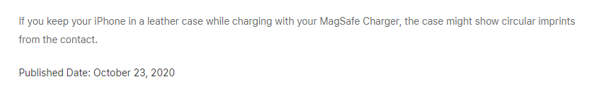 苹果还很鸡贼地在文档底部加了一行小字,意思是如果你用皮质手机壳加上 MagSafe 的话就会留下痕迹,你咋不早说呢。。。
