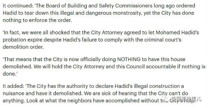 2015年12月,洛杉矶议会同样因为Mohamed私自扩建,违反多项规定,对他提出起诉。