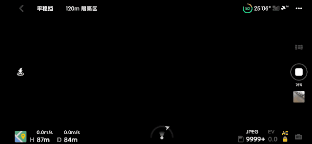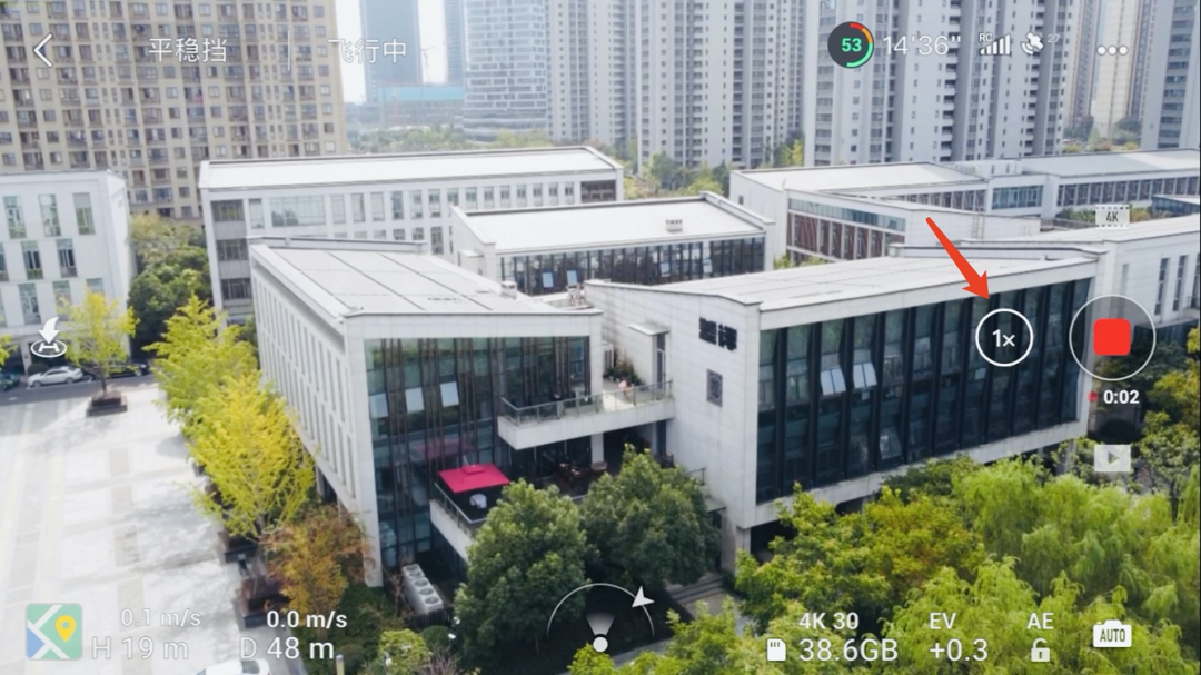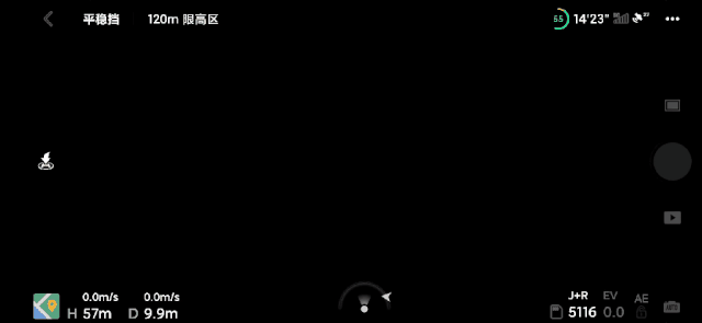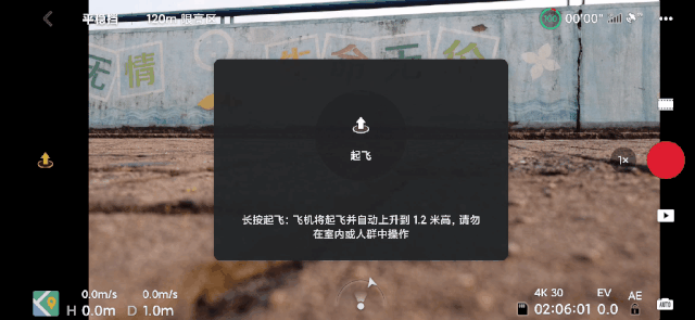 这两个都可以在手机上直接一键完成,长按起飞之后,差友们首先会看到无人机会在离地 1.2 米的高度自动悬停,等待我们对遥控器的下一步操作。