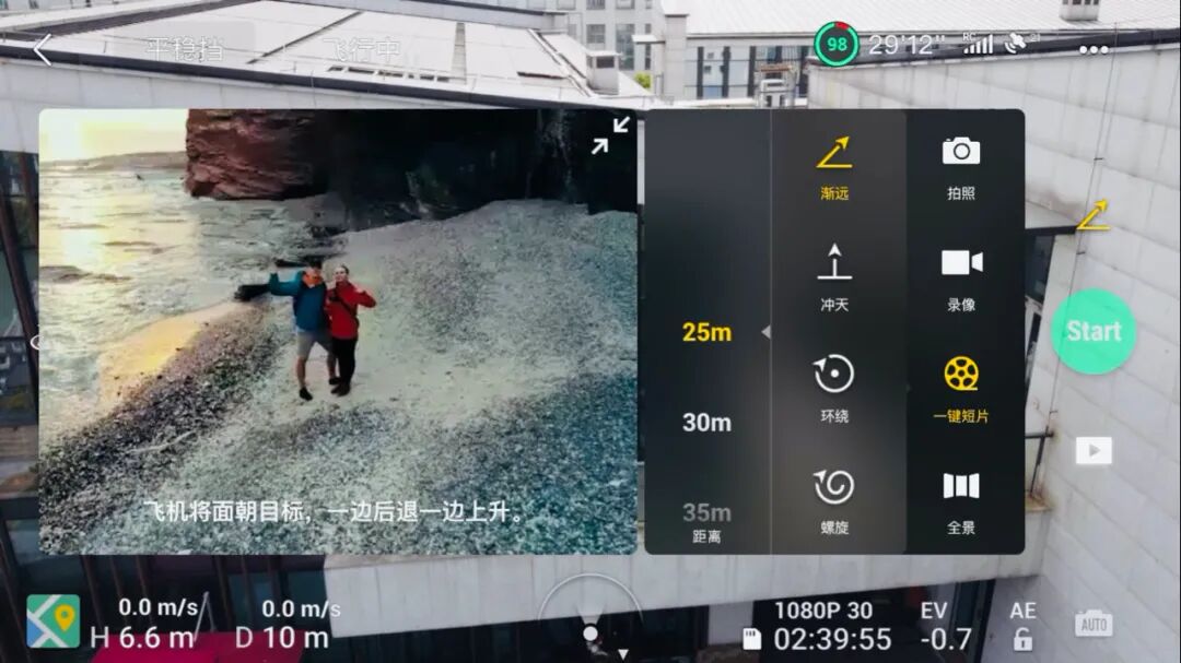 视频拍摄方面,Mini 2 自带一键短片功能,可以实现渐远、冲天、环绕、螺旋还有彗星效果。