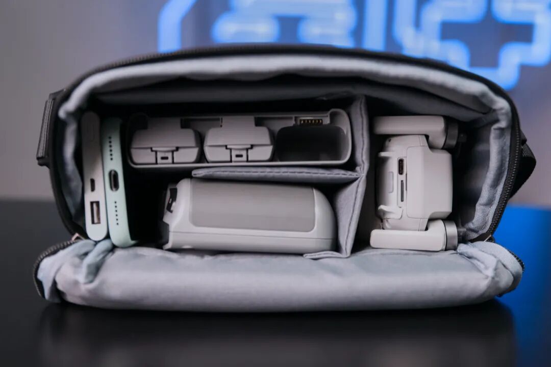 大疆在 Mini 2 畅飞套装里就有提供一个单肩包,托尼在陆续放进无人机、遥控器、三节电池以及充电器后,包内空间还够我塞俩充电宝和一部手机。