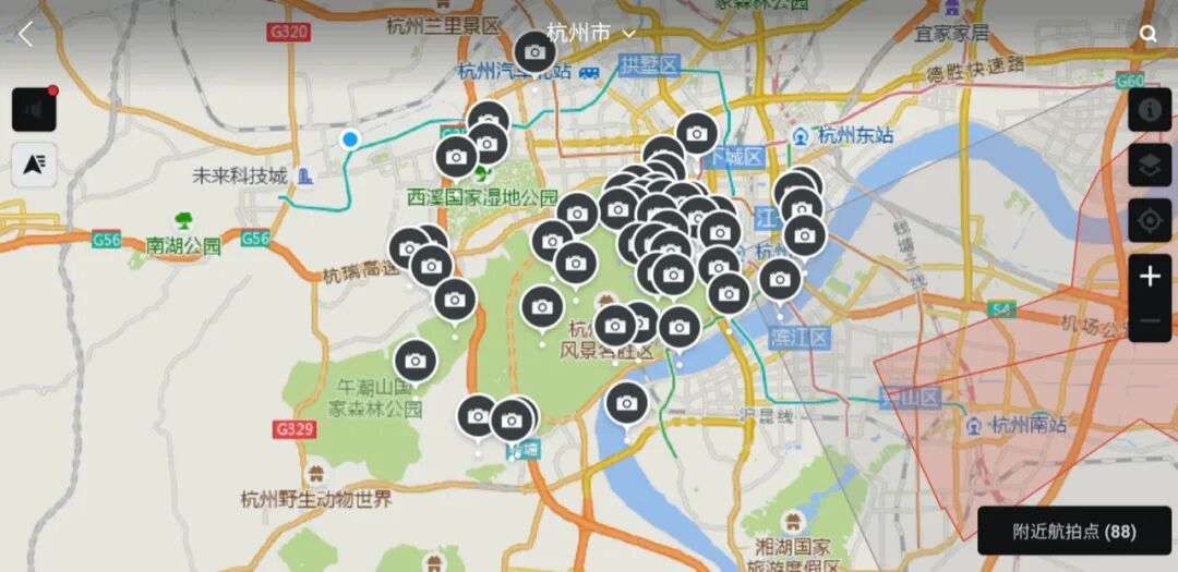 航拍第一步,当然是提前查下目的地能不能飞。托尼在 DJI Fly App 里简单看了下,发现杭州还是挺宽松的,除了机场区域其它地方都不限飞。