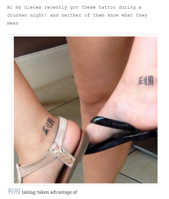 网友:“我的两个侄女在最近喝醉酒的一个晚上纹身了,但她们连这字样代表的是啥意思都不知道!”