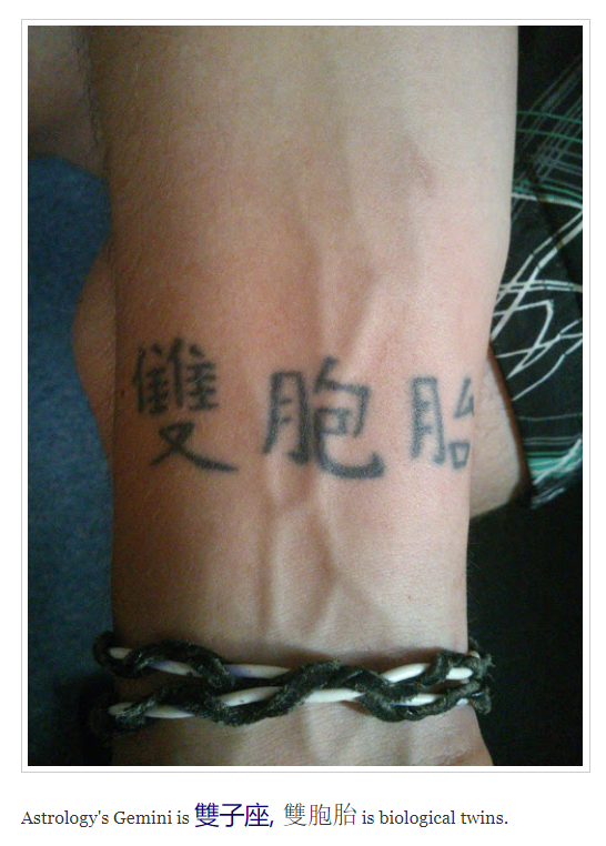 网友:“这是我室友在快到18岁生日前送给自己的一个纹身,他想纹的是‘双子座’的中文,