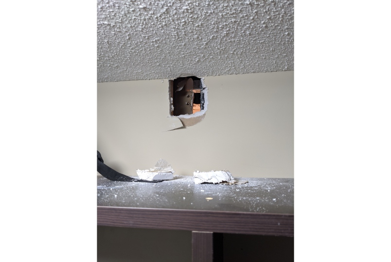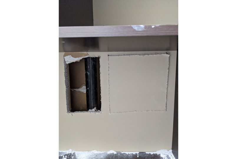 今年6月底,住在一楼的一户邻居家里漏水。因为管道属于物业公有资产,物业管理员便雇用了一名工人来修。然而管道是修好了,却在Eddie家的墙上留下好几个大洞。