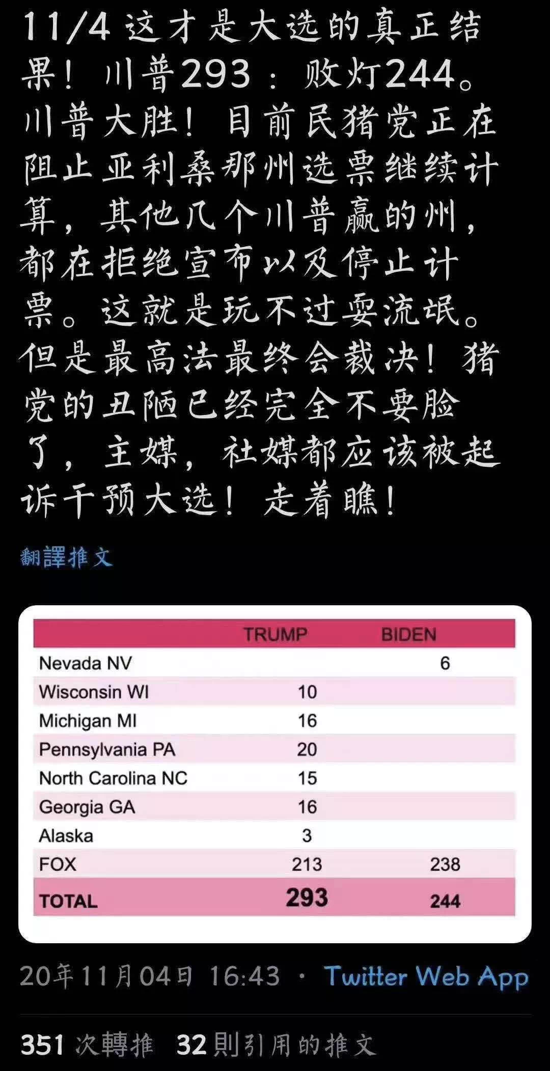 支持拜登的选票逐渐开出,摇摆州差距逐渐缩小,直到拜登赢得270票。