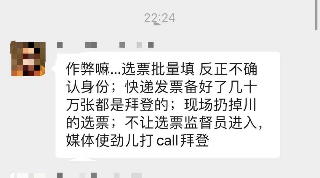 “美国大选选票不确认投票者身份,现场扔掉懂王的选票,换成拜登的。”