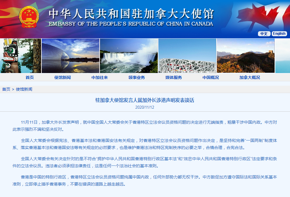 中国驻加拿大使馆回应加外长发表涉港声明:敦促加方遵守国际关系基本准则 停止插手香港事务