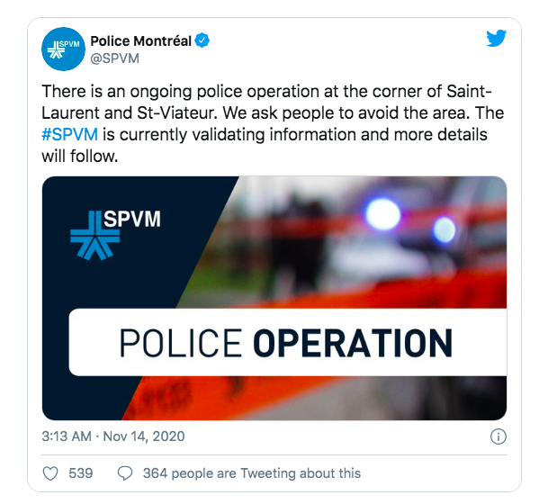 早些时候,围绕此次警方出动,有人质被劫持的流言广为流传。St-Viateur大街,以及包括St-Laurent,Clark St.和St-Dominique St.在内的几个十字路口都被警察封锁;现场有警察战术小队成员,包括持突击步枪的警察。