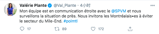 蒙特利尔市市长瓦莱丽·普兰特(ValériePlante)也表示,她的团队正在密切关注局势,并正在与警方保持联系,她呼吁居民出行时避开该地区。