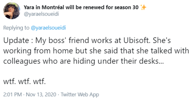 一位网友则在推特上说:“我老板的朋友在育碧工作。她自己是在家工作的,但是她说,她刚才在和躲在桌子下面的同事们说话。天哪到底发生什么了?!”