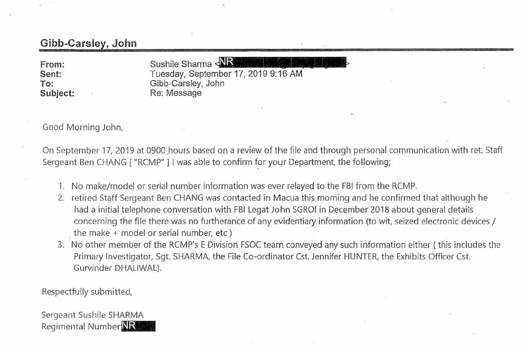 虽然有另一位RCMP官员称通过邮件联络到身在澳门的Chang警官,并向其确认当日并未将电子设备的型号、序列号等信息转发给FBI。